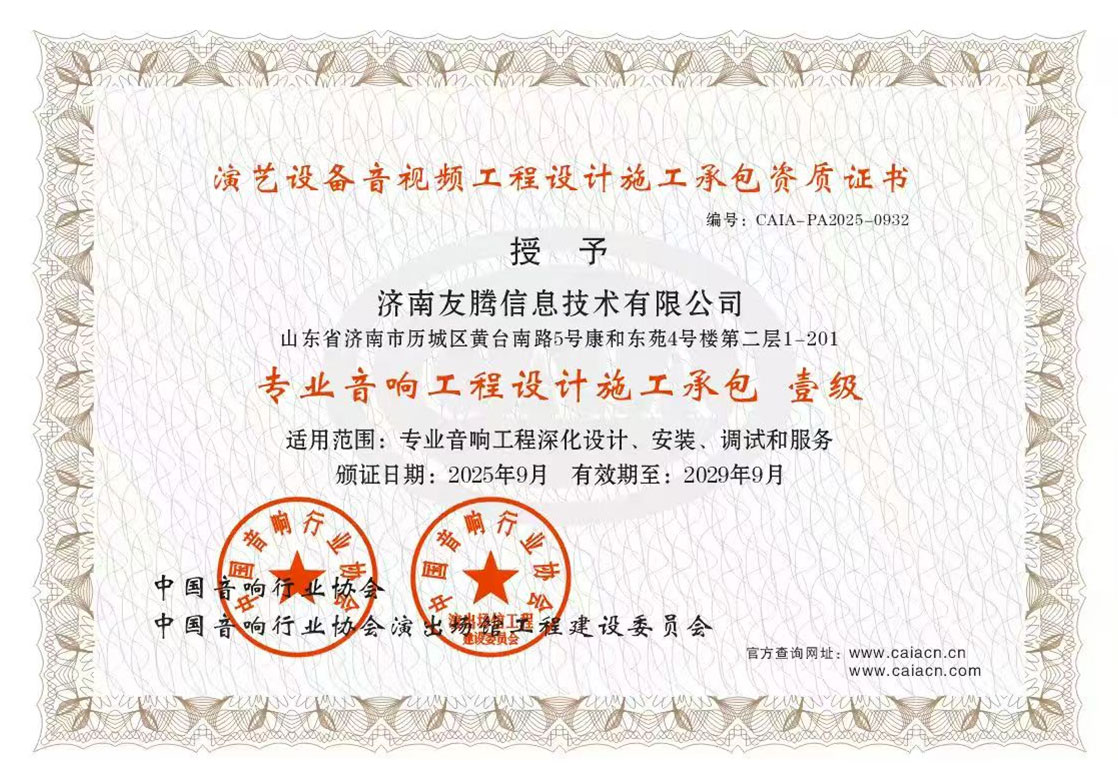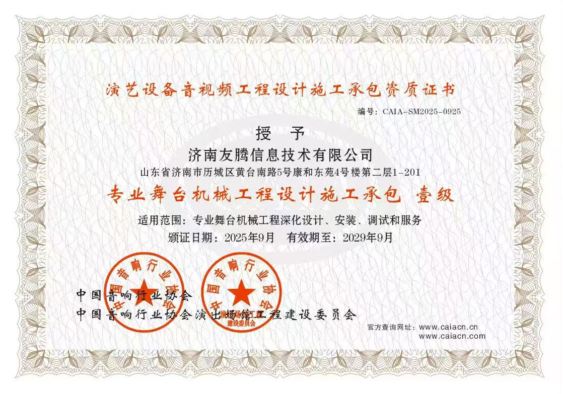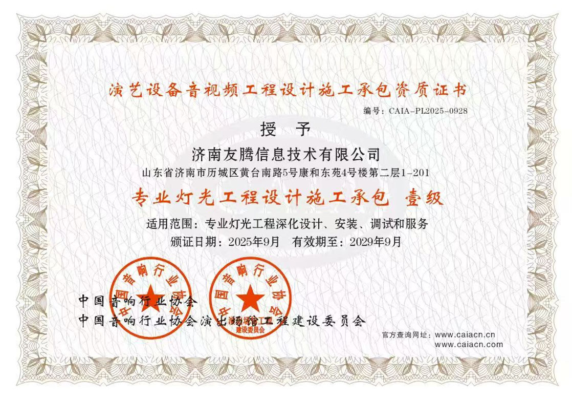 ООО Цзинань Ютэн Информационные Технологии основана в 2013 году. Ранее она являлась представительством компании Хайтянь Электроникс в провинции Шаньдун. Начав как поставщик профессионального аудиооборудования, компания прошла путь динамичного развития на протяжении более десяти лет и в настоящее время превратилась в одного из ведущих поставщиков комплексных решений в области звука, света и сцены. Сочетая передовое импортное и отечественное оборудование, компания создаёт высококачественные, высокотехнологичные и высокоэффективные решения для профессиональной сцены, предлагая полный спектр услуг по технической реализации проектов.